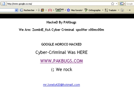 Maroko „Google“ tinklapis buvo „nulaužtas“ „PAKbugs“ hakerių grupuotės. Hakeriai taip pat patalpino atitinkamą pranešimą ir nuoroda į „PAKbugs“ saitą.