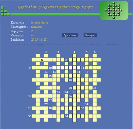 Kažkurį laisvesnį savaitgalį nusprendžiau pailsėti, bet tuo pačiu neleisti smegenims užmigti – pasiėmiau kryžiažodžių žurnalą. Kažkada vaikystėje būdavau mėgėjas visokių „Oho”, „Aha” ir kitų laisvalaikio leidinių, netgi siųsdavau teisingus atsakymus paštu. Niekada nieko nelaimėjau, bet vis tiek buvo šiek tiek azarto. Dabar paėmus kryžiažodžių žurnalą į rankas, besprendžiant apėmė kitokios mintys: gi 21 amžiuje gyvenam, kas dabar perka kryžiažodžius? Visi juk sėdi kiaurą parą internete, kodėl ten neperkėlus šios mini-atrakcijos? O gal kažkas jau yra padaryta? Tada pradėjau ieškoti, ir štai kas iš to gavosi.