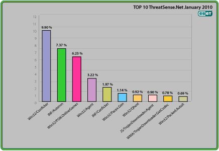 Jame teigiama, kad internete pastarąjį mėnesį ir toliau aktyviai puolė išplitę virtualūs kenkėjai: ESET skelbiamame pavojingiausių sausio mėnesio virusų dešimtuko pirmojoje vietoje aptiktas daugiausia kompiuterių užkrėtęs kirminas „Conficker“, plintantis per operacinės sistemos „Windows“ spragas. Sausį vartotojus ir toliau aktyviai atakavo virusai „INF/Autorun“, „Win32/PSW.OnLineGames”, „Win32/Agent“, „INF/Conficker“, kenkėjiškos programos „Win32/Pacex.Gen“, „Win32/Qhost“ ir „WMA/TrojanDownloader.GetCodec“.